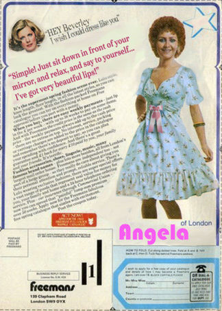 Costume designs and renders of Tony, Angela, Susan, Beverly and Laurence. These were made by altering 70s magazine adverts in Photoshop, as though they were torn from one of Beverly’s magazines. Original source material shown in small.