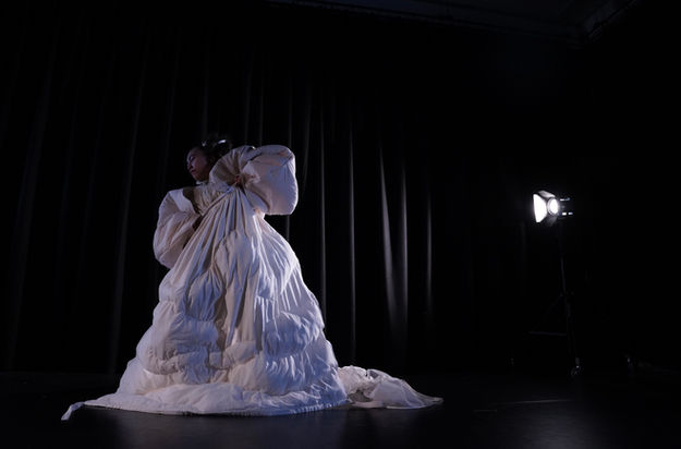 As an extension of the previous project on Hansel & Gretel, the work continues to question the relationship between costume and space, but this time through what lies outside the self. What if space is something we carry with us? A veil that settles over us as we move through life, shifting and layering without us realising.