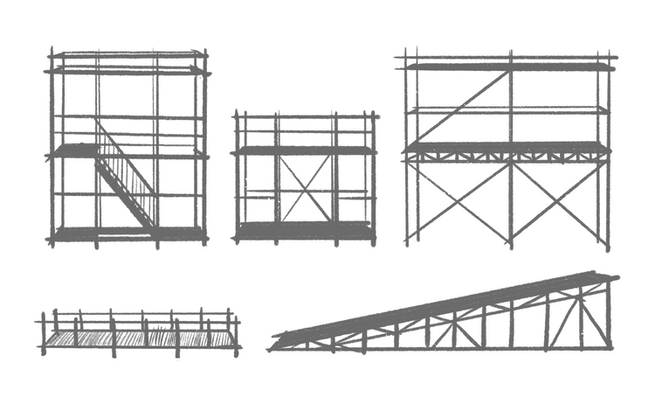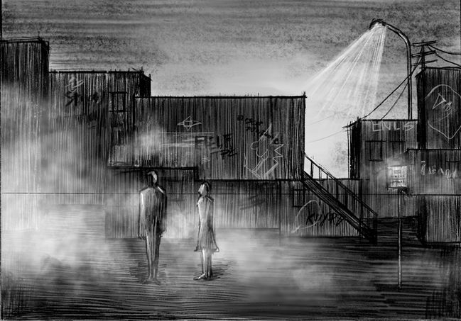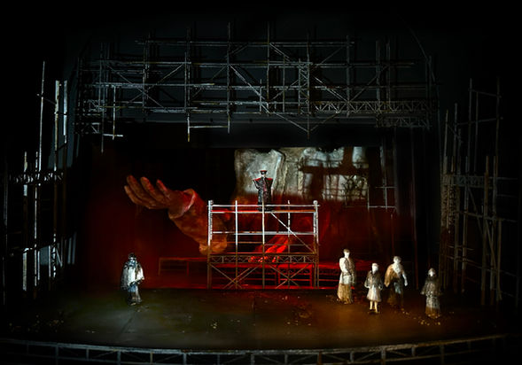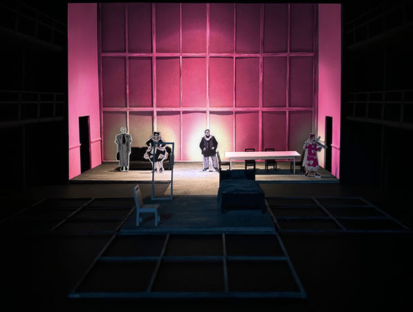 To reflect the work’s rapid transitions and shifting emotional landscapes, the design rejects literal street settings. Instead, modular box structures made from varied materials express the distinct character of each city, supported by small symbolic props. This abstract approach prioritises psychological experience over physical realism, enabling fluid scene changes whilst tracing the protagonist’s inner transformation.