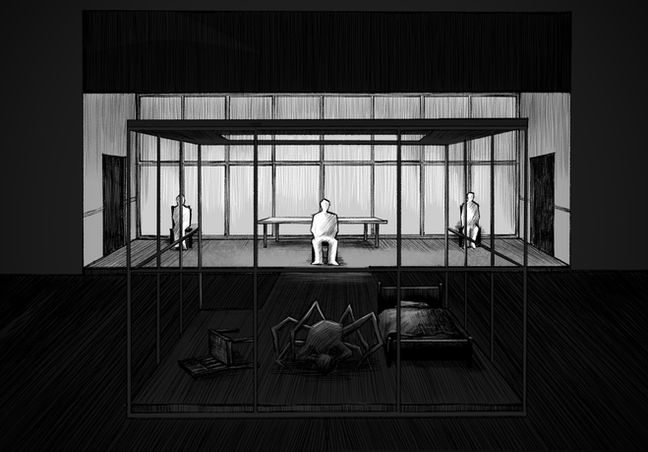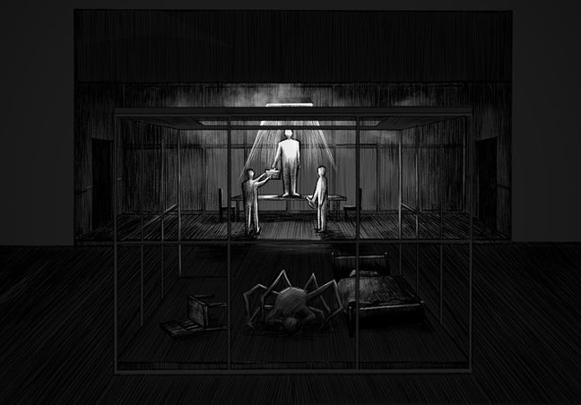 This design is based on Metamorphosis, Lemn Sissay’s physical theatre adaptation of Franz Kafka’s classic tale. The story follows Gregor Samsa, a travelling salesman who wakes one morning to find himself transformed into an insect. As his physical condition worsens, his family’s fear and rejection grow, revealing the fragility of human empathy and the suffocating pressures of domestic life.
